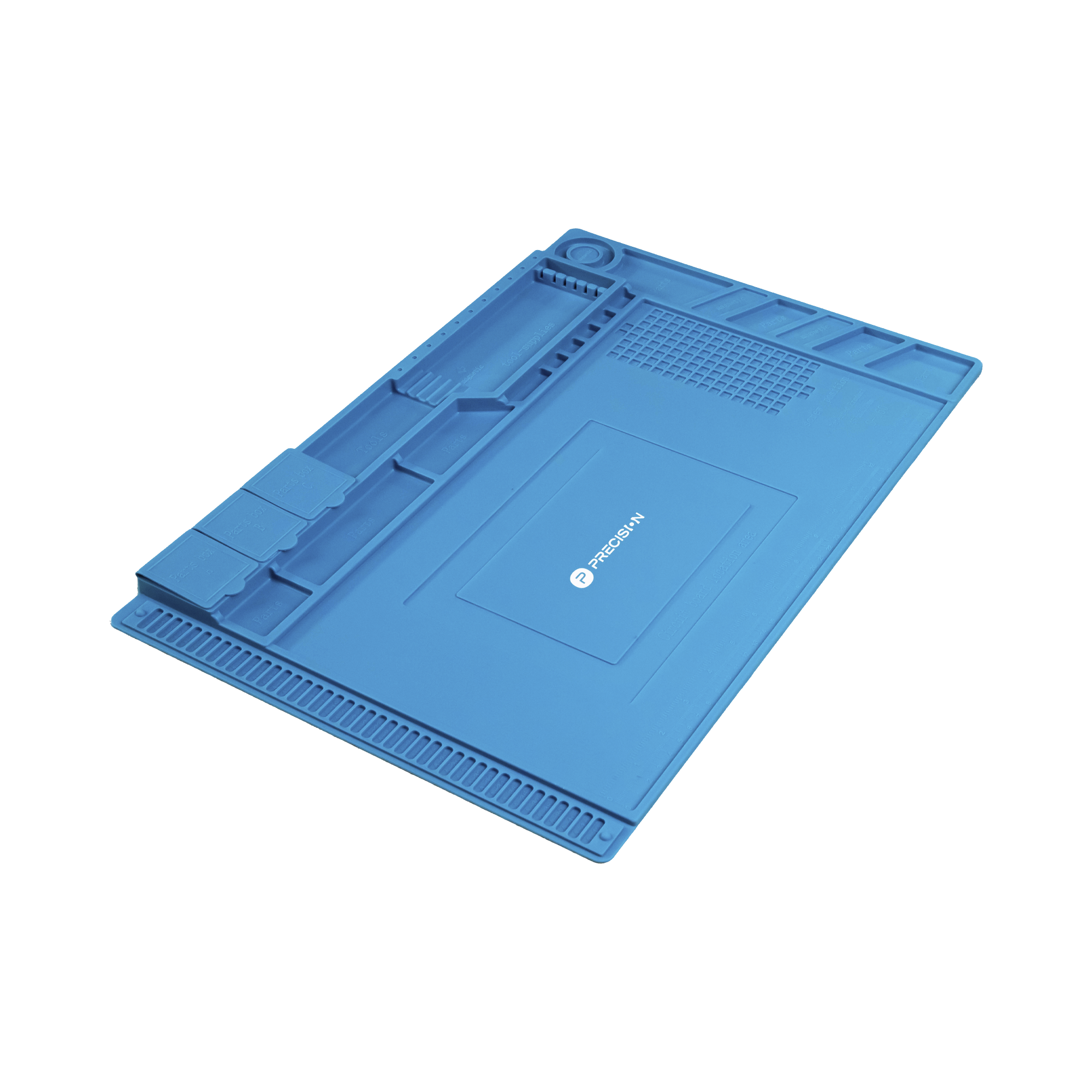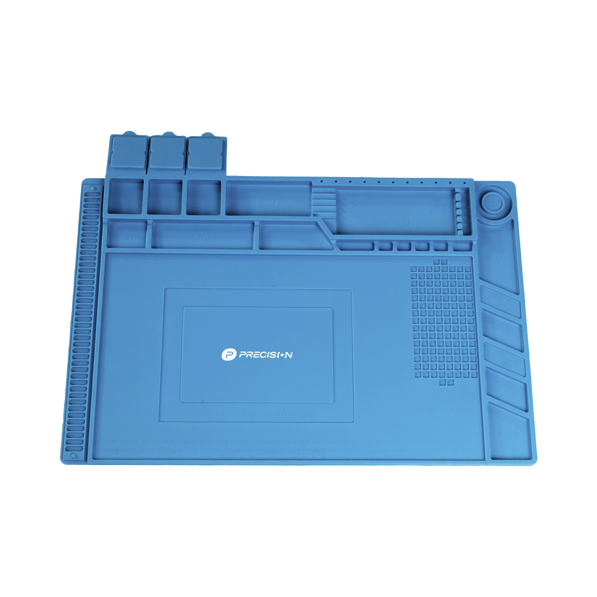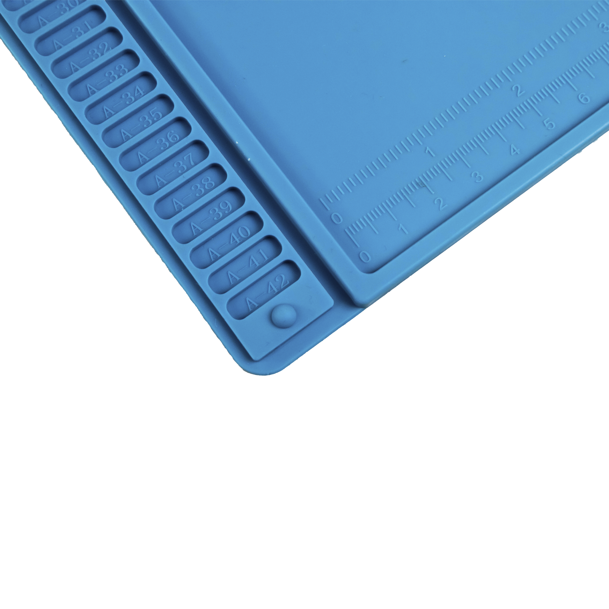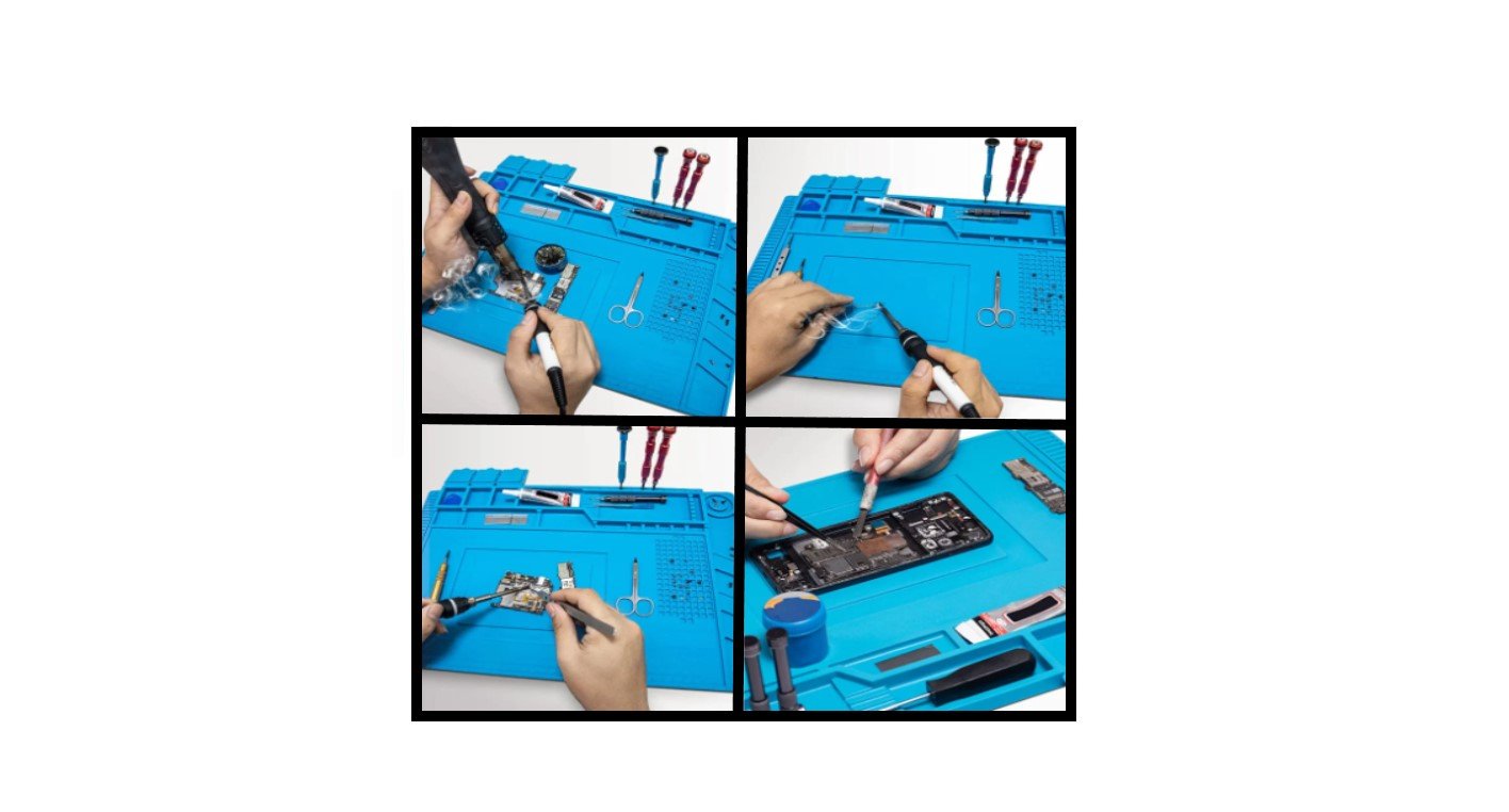 - Este innovador tapete de silicona de 45 x 30 cm está diseñado específicamente para facilitar y optimizar las tareas de reparación de equipos y tarjetas electrónicas.